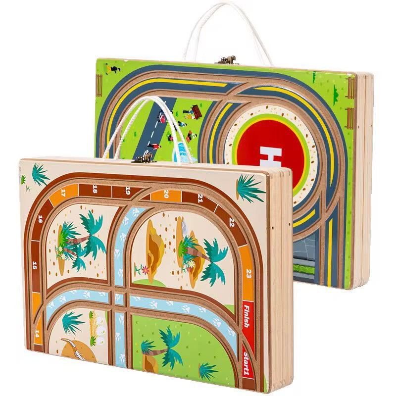The entire play set folds neatly into a compact wooden case with a carry handle, making it perfect for travel, restaurant visits, or grandparent trips. Kids can easily pack up their toys inside and carry it wherever they go — no mess, no loose parts.