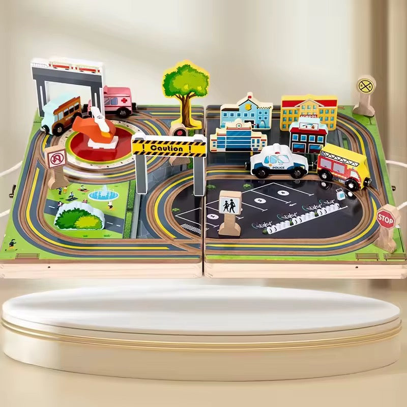 - Urban Road & City Scene: Complete with roads, bridges, trees, buildings, and signboards, children can learn about everyday city life and traffic rules while role-playing with wooden vehicles.