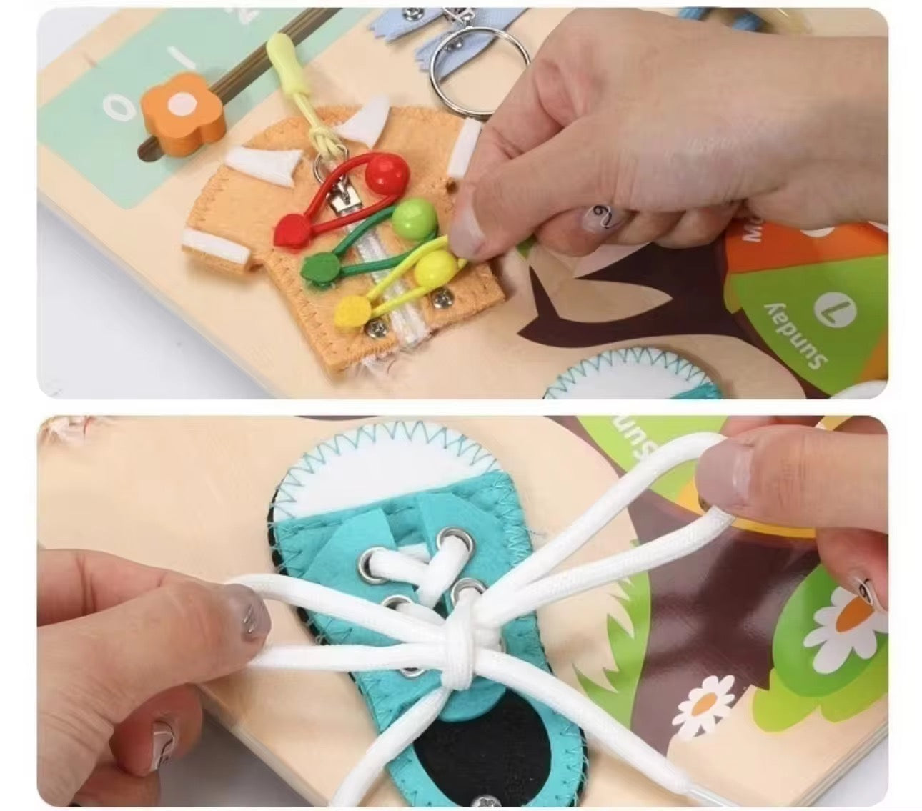 ✔ Colorful Fastening Board – Helps children learn how to “wear clothes” independently