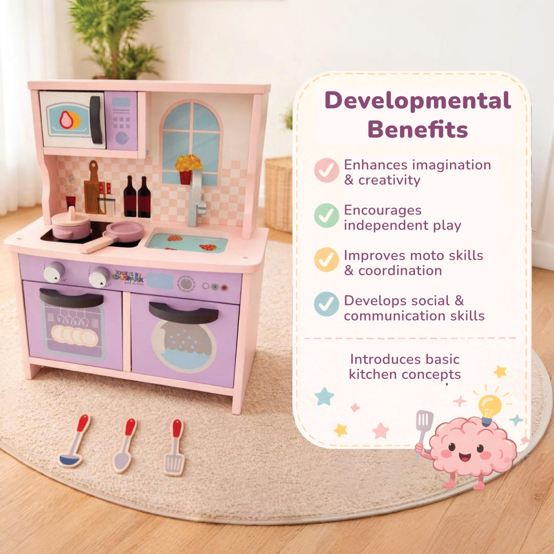 Introduce your child to the joy of pretend cooking with the Eduspark Mini Chef Wooden Kitchen, a compact and budget-friendly play kitchen designed for early learners. Perfect for small homes, play corners, and first-time pretend play setups, this mini kitchen gives children a complete cooking experience in a smaller, easy-to-manage size.