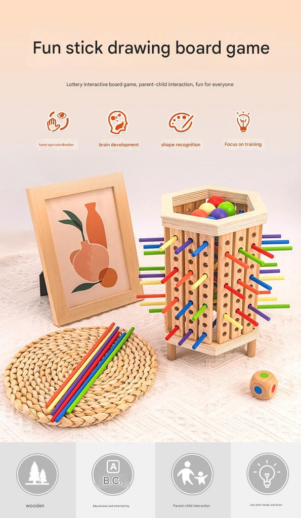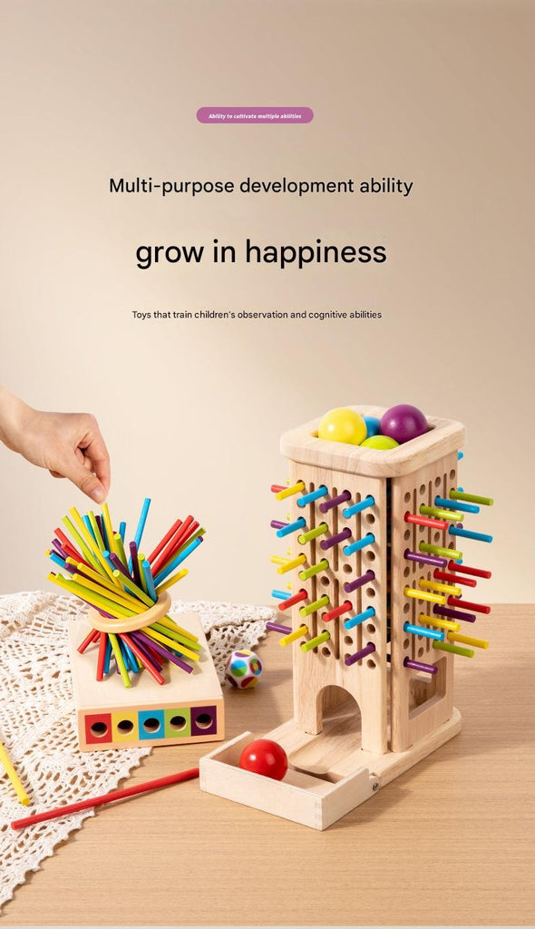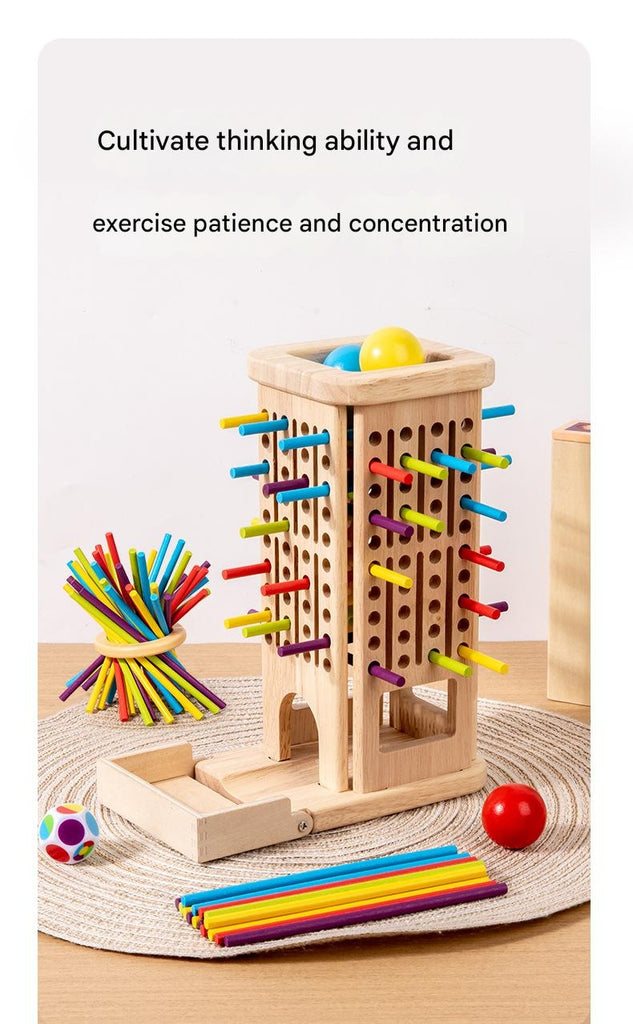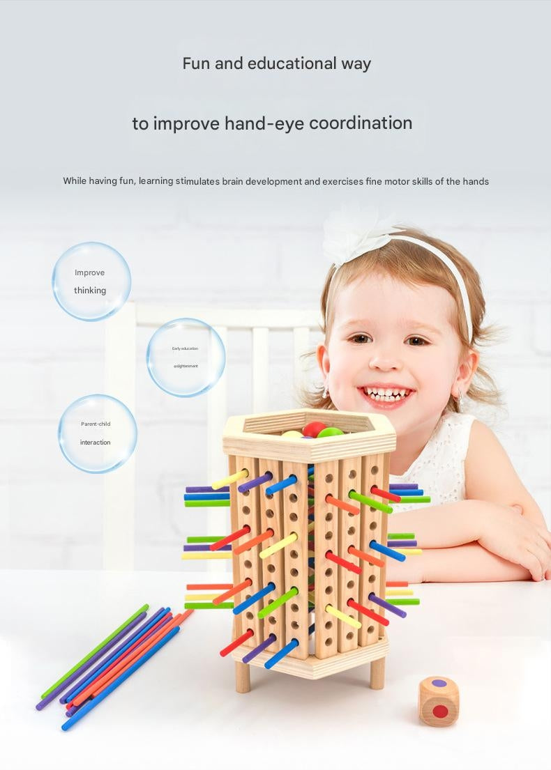 At its heart is a solid natural-wood tower frame, expertly drilled with dozens of round peg-holes along its four sides, combined with vibrantly coloured wooden sticks, large wooden balls and a ring accessory. Children insert, extract or balance sticks through the tower, send a ball dropping through the tower’s chamber, and take turns pulling sticks one-by-one as part of a mini challenge game. The tactile wooden construction ensures safe, sturdy play; the smooth finish and rounded edges promote hand-friendly interaction.