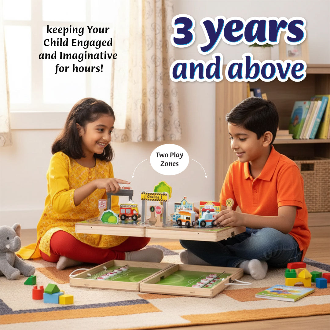 Bring endless adventure to your child’s playtime with our 2-in-1 Wooden City & Soccer Play Set. Designed for imaginative minds, this double-sided foldable play box transforms from a bustling miniature city to an exciting tabletop soccer arena in seconds. Whether it’s racing cars through busy streets, rescuing people with the fire truck, or scoring the winning goal, this versatile toy inspires hours of screen-free fun.