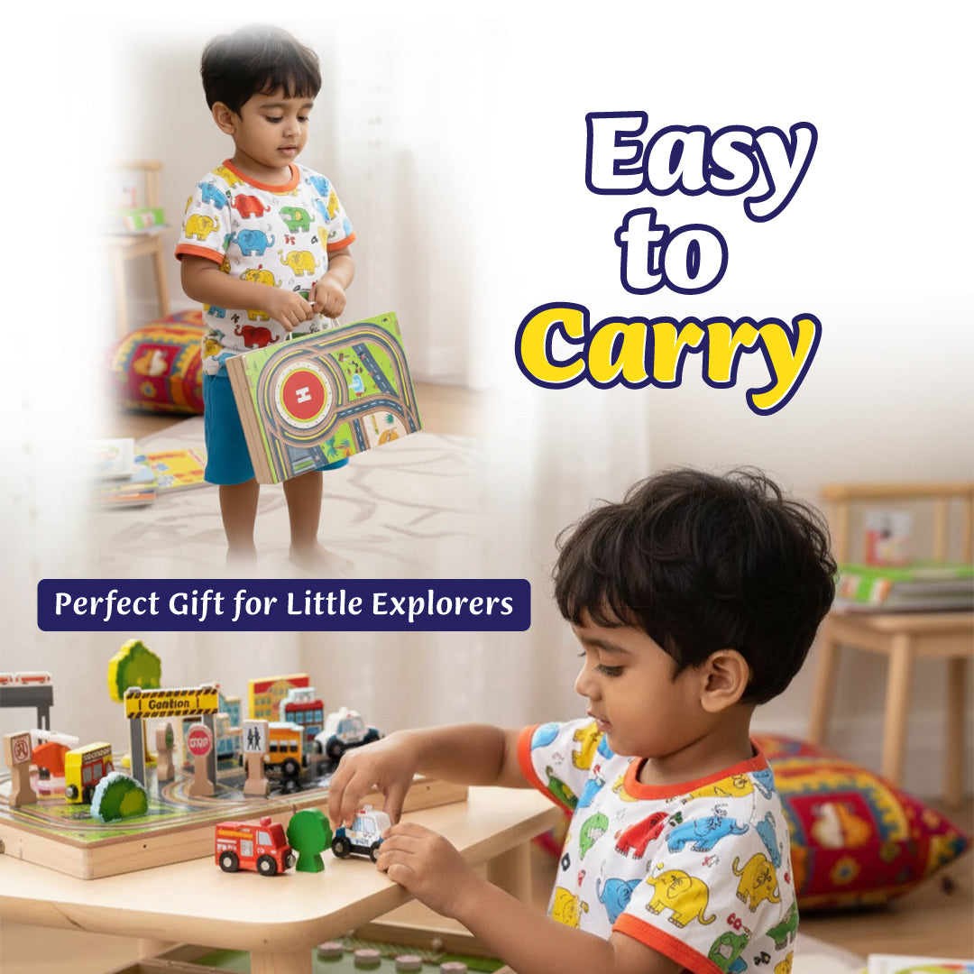 The entire play set folds neatly into a compact wooden case with a carry handle, making it perfect for travel, restaurant visits, or grandparent trips. Kids can easily pack up their toys inside and carry it wherever they go — no mess, no loose parts.