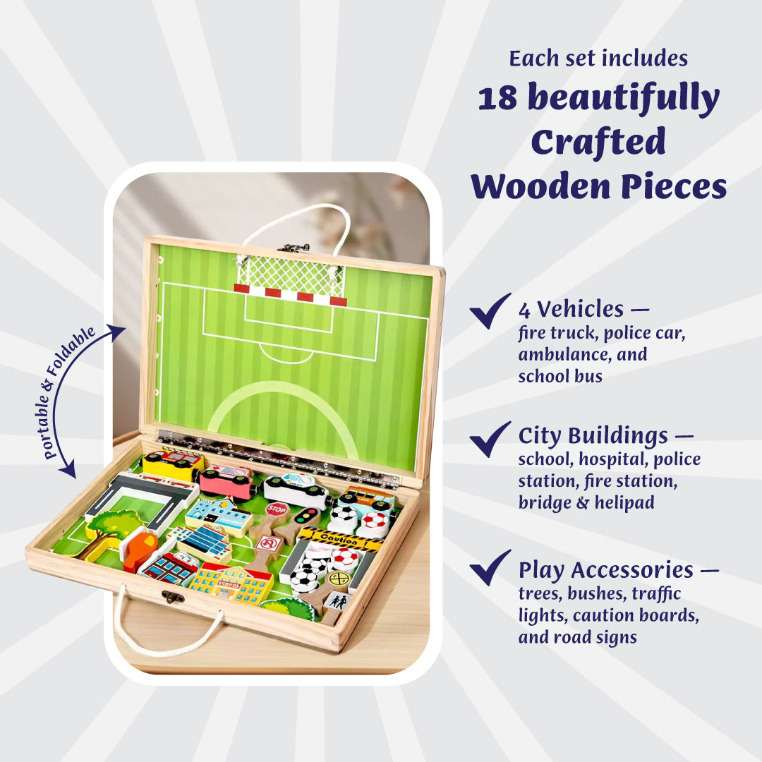 2-in-1 Wooden City Road & Soccer Play Set | Portable Foldable Activity Box for Kids | 18-Piece Vehicle & Building Playset | Montessori Travel Toy