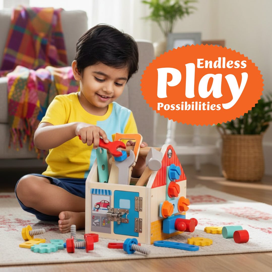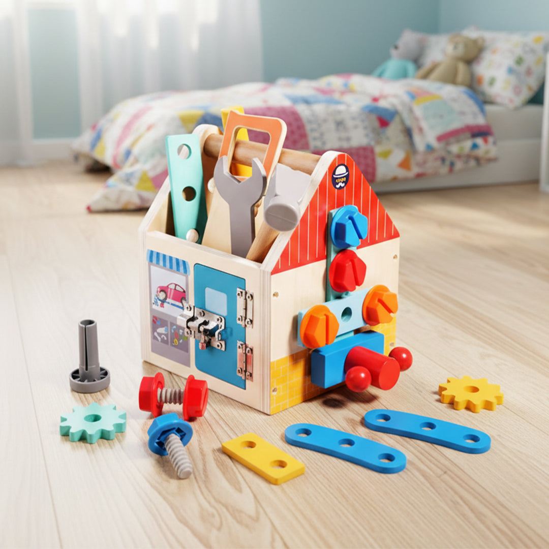 The tool house doubles as an activity box, a portable toolbox, and a construction table, giving your child multiple modes of play in one compact product.