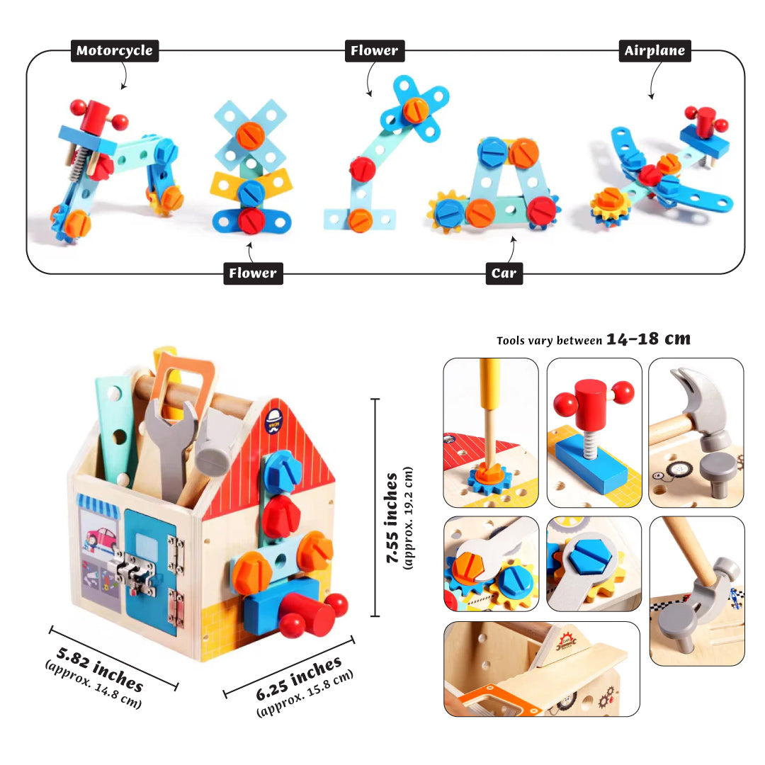 Perfect for toddlers and young children, this multifunctional tool house includes 33 colorful accessories—from nuts and bolts to gears, wooden tools, building boards, and a locking door—giving children endless opportunities to explore, build, create, and imagine.
