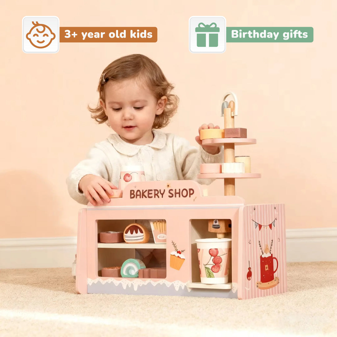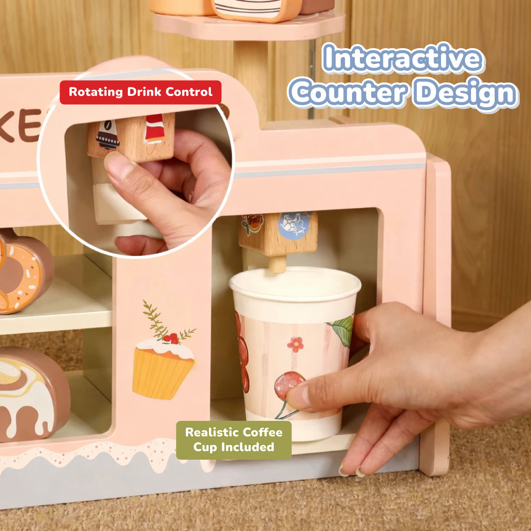 Wooden Bakery Shop Pretend Play Set for Kids – Dessert Counter Toy with Coffee Dispenser & Accessories | Montessori Role Play Toy (3+ Years)