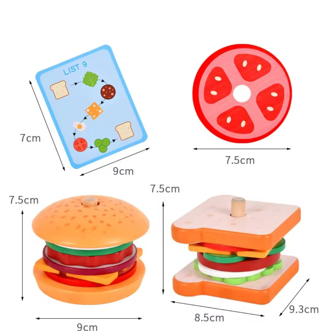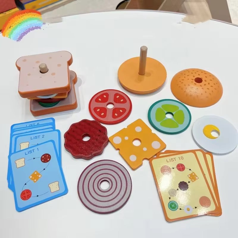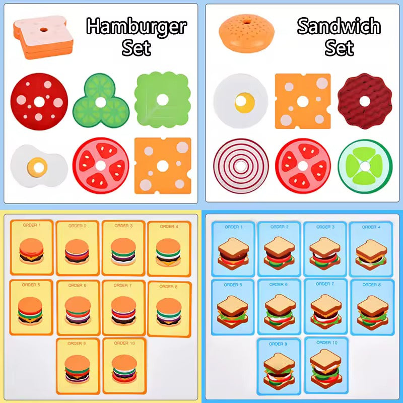 Children use illustrated order cards to build their food in the correct sequence by stacking wooden ingredients onto a sturdy peg base. Each step challenges them to observe, analyze, and think logically—boosting problem-solving skills while enjoying imaginative role play.