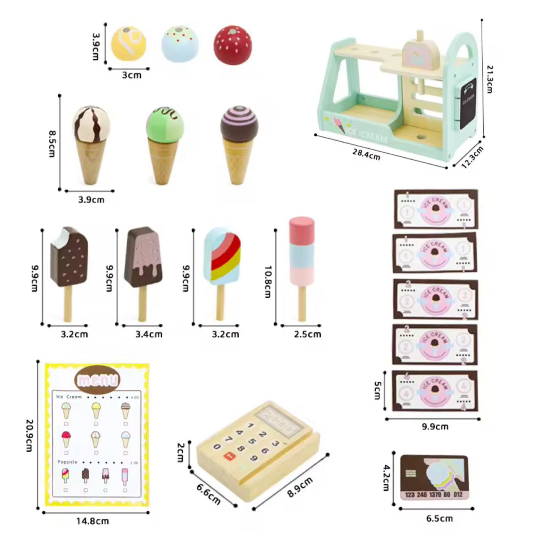 This thoughtfully curated set includes wooden ice cream cones, popsicles, dessert pieces, play currency, a mini cash register, and a charming display counter with sliding features and a chalkboard-style sign. The hands-on design allows children to sort, stack, match, and serve—making play both engaging and educational.