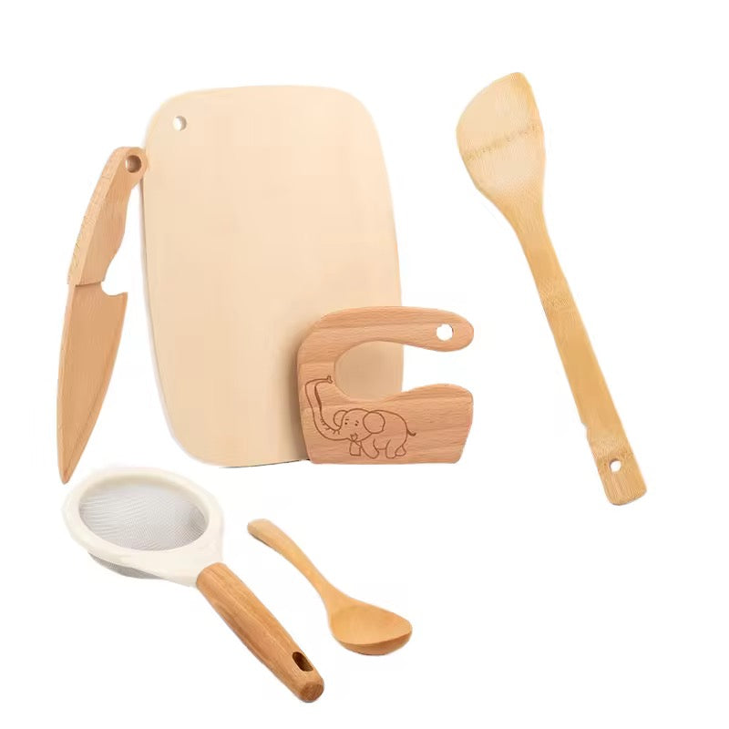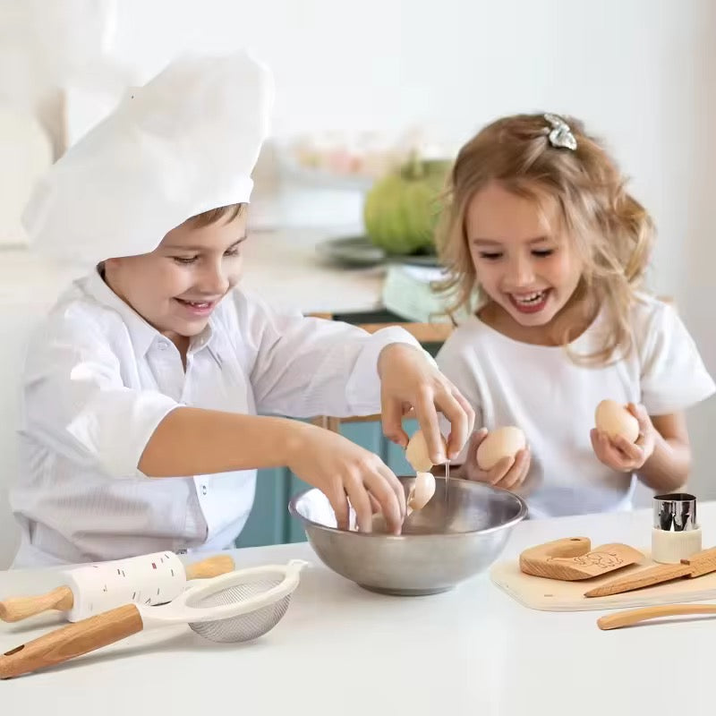Made from smooth natural wood and food-safe materials, this set allows children aged 3+ to safely cut, mix, roll, whisk, and prepare food just like adults — while building independence, confidence, and essential life skills.