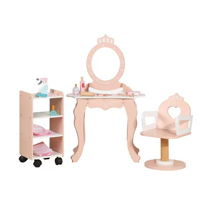 Includes wooden dressing table with mirror, salon chair, trolley and realistic beauty accessories like hair dryer, comb, scissors, perfume, spray bottle and more.