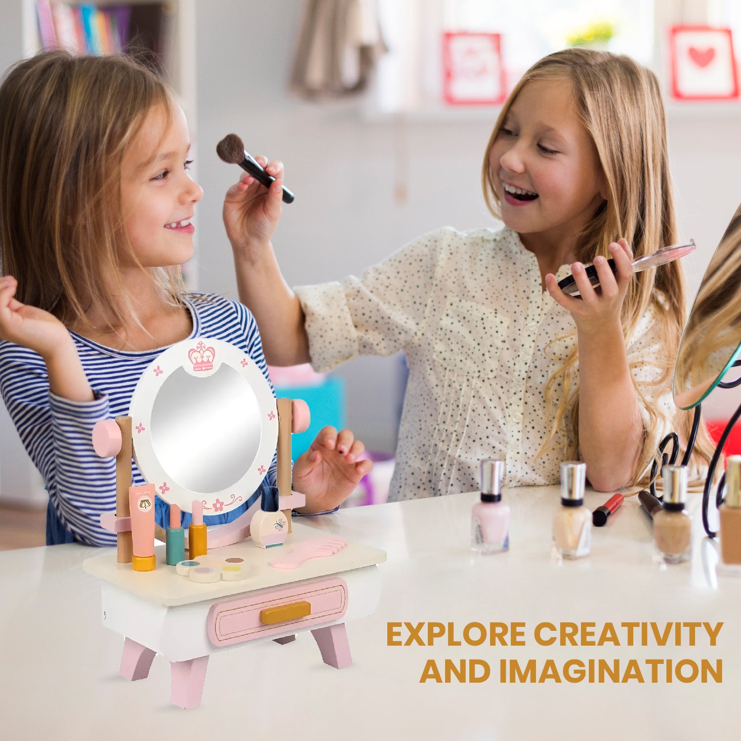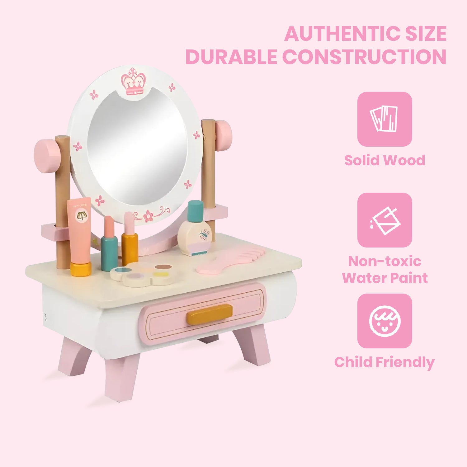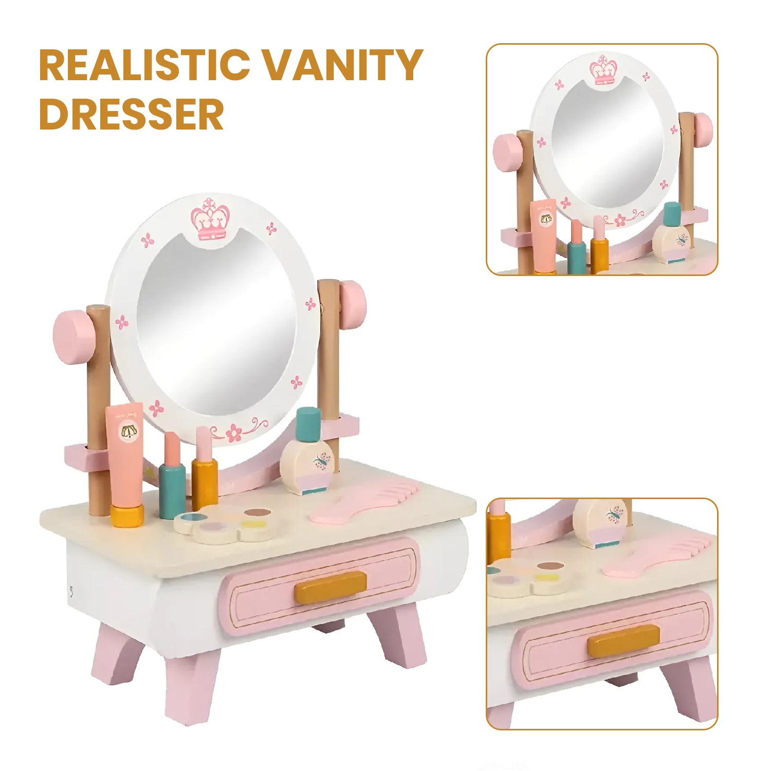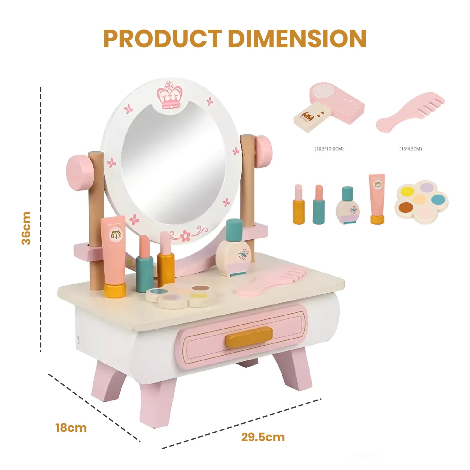 This unique and fun pretend  mini dressing table for children stands 36cm high and features a safe, rotating mirror and a cute drawer for storing accessories. This Kids Dressing Table comes with 7 delightful accessories, including a wooden comb, cream tube, 2 lipsticks, nail polish, eye shadow, and a hair dryer, offering endless opportunities for makeover fun and imaginative play. Your child will love creating countless stylish looks and engaging in creative role-playing with this Kids Pretend Play Set.Indulge your child's imagination and development with this Girls Vanity Table, a perfect addition to any young girl's playroom.