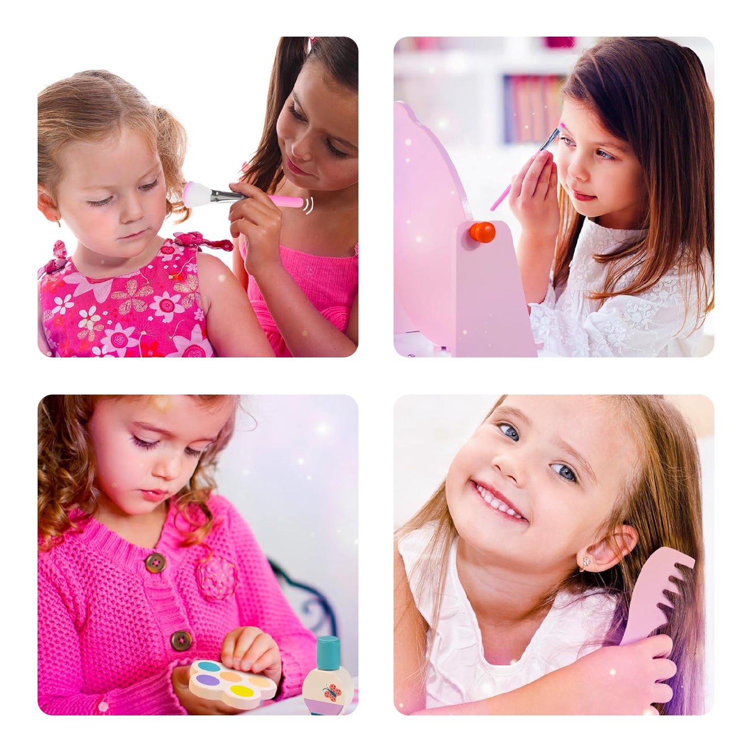 Safe for Children: Safety is a top priority with this pink mini dressing table. Each makeup accessory is crafted from high-quality wooden materials, ensuring they are non-toxic and safe for children to use. The toy is thoughtfully designed with rounded edges and smooth finishes, providing parents with peace of mind while their little ones enjoy their playtime.