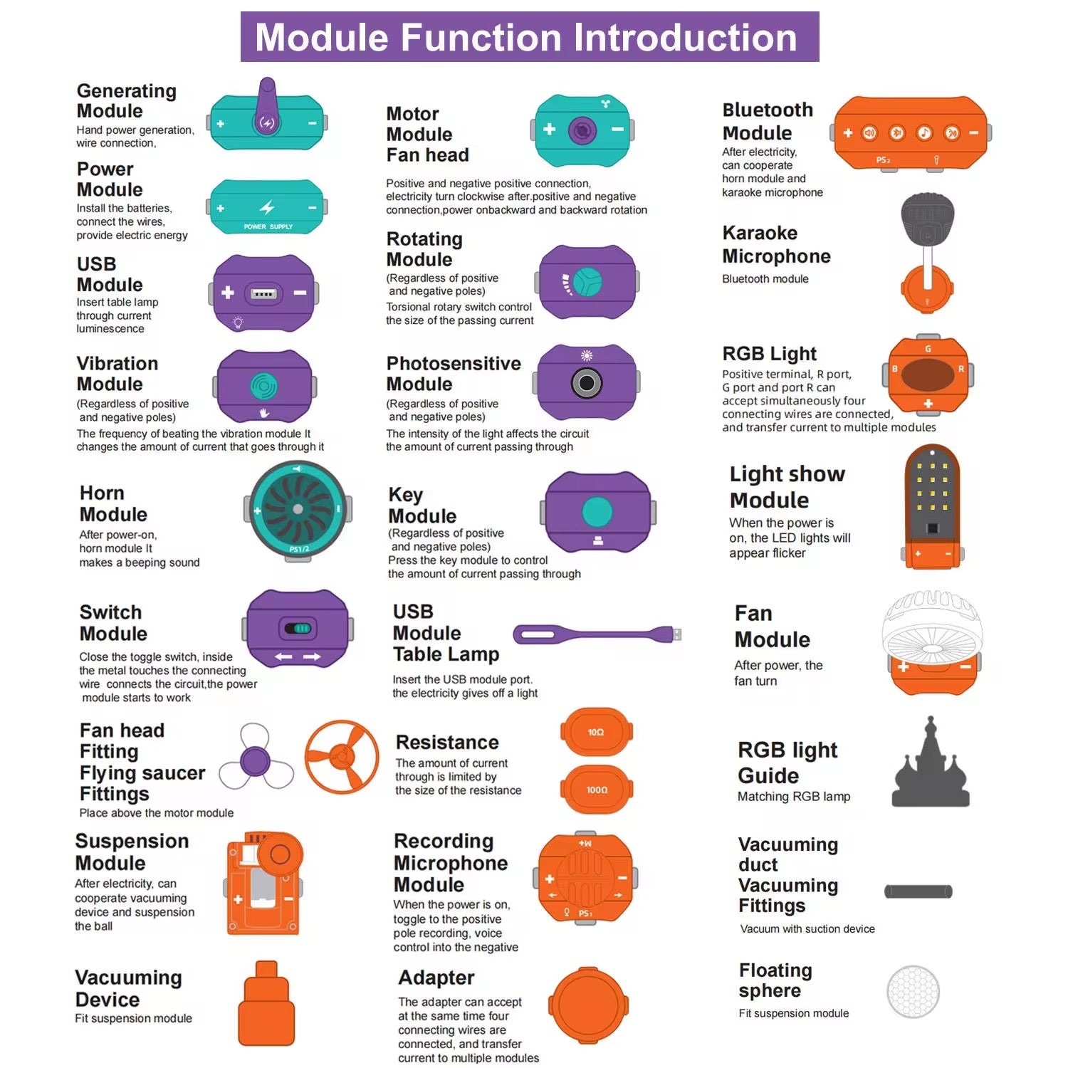 Children can assemble countless combinations using the included modules. Each experiment teaches a new concept in electronics and physics.